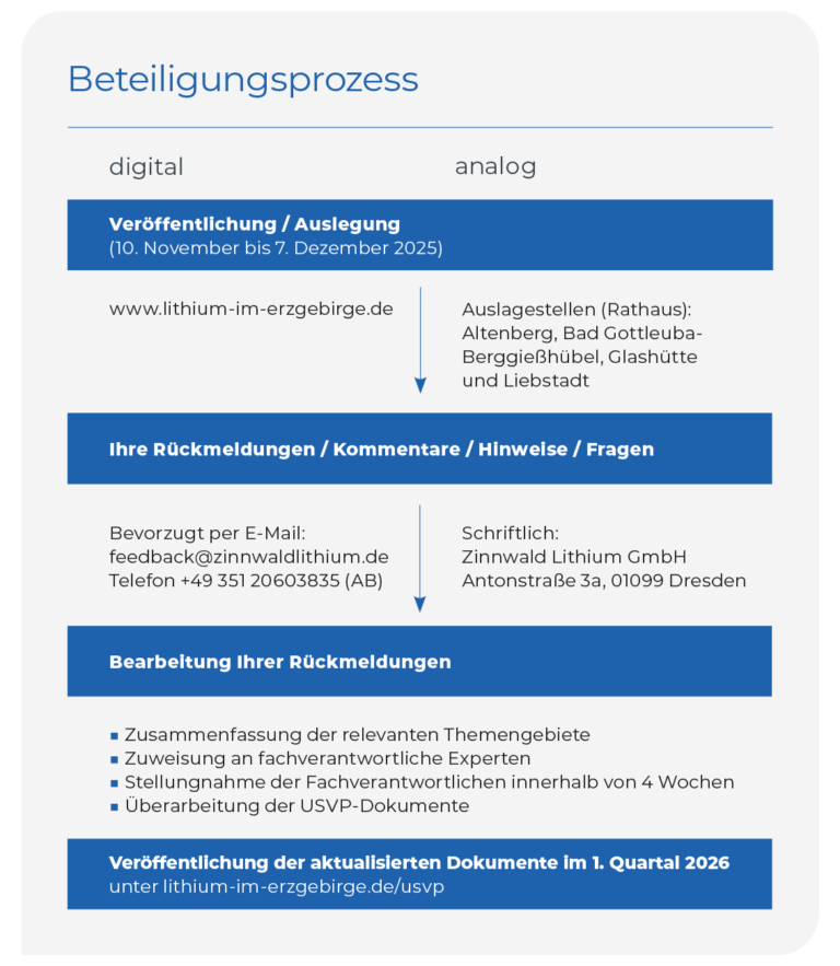 Wir freuen uns über Ihr Feedback zum Untersuchungsrahmen. Dies können Sie online über das untenstehende Formular, per E-Mail an feedback@zinnwaldlithium.de, telefonisch, per Post sowie in den Rathäusern von Altenberg, Bad-Gottleuba, Liebstadt und Glashütte abgeben. Alle eingehenden Punkte werden bearbeitet und dokumentiert.