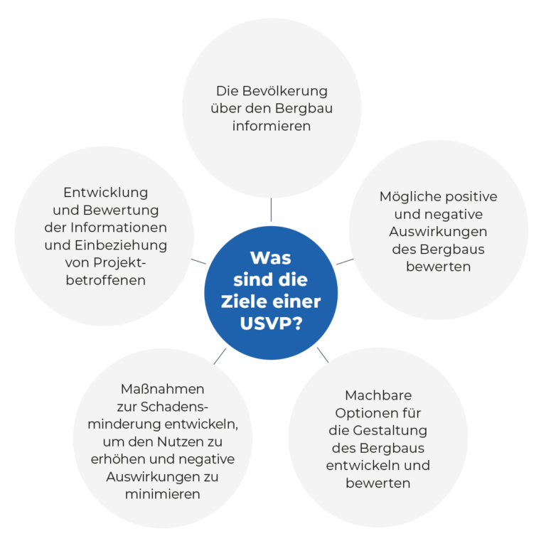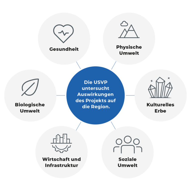 Die USVP ist eine freiwillige umfangreiche Studie der Umwelt- und Sozialverträglichkeit einer industriellen Ansiedlung und eines Bergbauvorhabens. Im Rahmen dieser Untersuchung wird analysiert und prognostiziert, ob beziehungsweise welche Folgen für Natur, Mensch und das soziale Miteinander in der Region entstehen können.